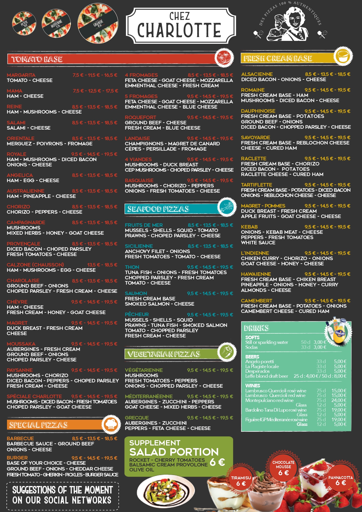 For more than 20 years, Chez Charlotte has been a well-known and much-loved address in Vendays-Montalivet and the Médoc area. Popular with both locals and holidaymakers, this friendly pizzeria has built its reputation on one simple promise: authentic wood-fired pizzas made in the great Italian tradition. Here, quality, consistency and a warm welcome are at the heart of everything.